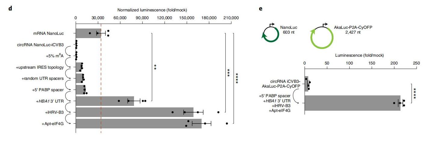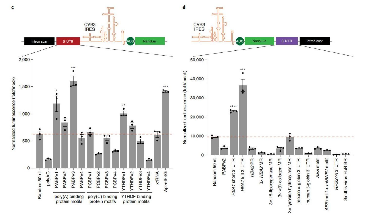 mRNAs中的5′和3′UTR可以招募RNA结合蛋白(RBPs),从而实现强大的翻译以及转录后调控的各个方面。作者在环状RNA上验证发现,5′UTR区域增加PABP基序和eIF4G招募适体对翻译的改善最大,用短或全长形式的HBA1 3′UTR替换3′UTR端间隔区域也可以显著提高翻译强度。