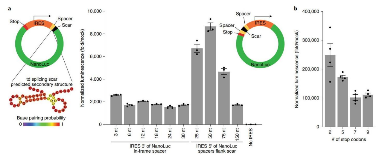虽然,IRES直接位于基因上游具有较高的翻译效率,内含子剪接疤痕对IRES介导的环状RNA翻译影响不大。此外,通过添加50 nt间隔子,将IRES和相关基因从剪接疤痕中分离出来,可以改善环状RNA的翻译(图1)。