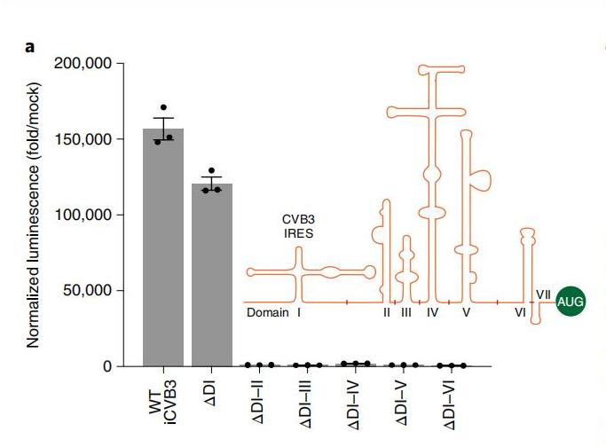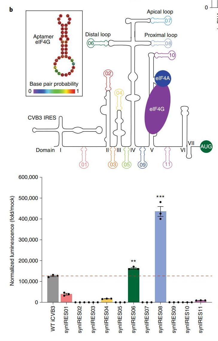 eIF4G在启动环状RNA中IRESs的翻译中起着关键作用,作者设计了iCVB3的合成变体,在其中合理地插入Apt-eIF4G,结构域IV的十字形结构最容易插入Apt-eIF4G。在结构域IV的远端和近端环中分别插入Apt-eIF4G的synIRES06和synIRES08均显示出比野生型iCVB3显著改善的翻译。