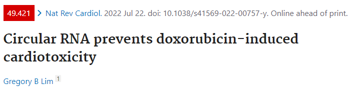 2022年7月22日,Nature Reviews Cardiology杂志主编Gregory B Lim对上述的Circ-INSR相关研究发表评论性文章《Circular RNA prevents doxorubicin-induced cardiotoxicity》。基于体外人工制备的circRNA mimics拥有巨大的Translational perspective,Gregory Lim主编根据Original article两位一作Dongchao Lu和Shambhabi Chatterjee的论述,探讨分析了从编码胰岛素受体基因衍生的环状RNA(Circ-INSR)的过度表达可防止因使用阿霉素进行抗癌治疗而发生心脏功能障碍的发展。Circ-INSR是一种新的、丰富的、高度保守的环状RNA,具有良好的治疗潜力。