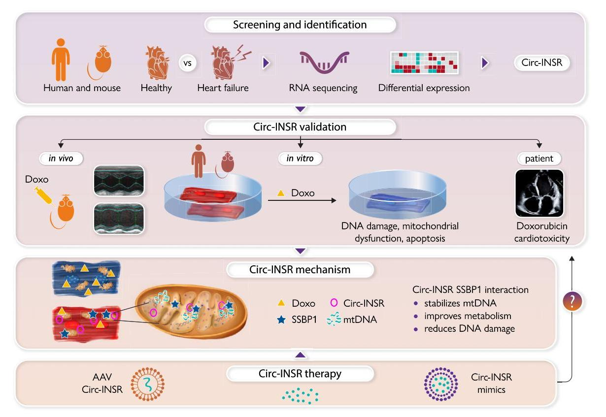 在这项工作的基础上,Lu、Chatterjee及其同事筛选了新的环状RNA,并确定Circ-INSR是在阿霉素诱导的心脏毒性应激下心肌细胞活力的重要调节因子。在啮齿动物和接受阿霉素治疗的患者中,Circ-INSR下调,导致心肌细胞死亡和心功能不全。