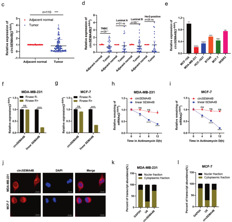 在这项研究中,作者在BC的PI3K/AKT信号通中筛选出7个具有蛋白编码潜能的circRNA。在15对BC组织和癌旁组织检测中发现在BC组织中显著低表达的hsa_circ_0000650,命名为CircSEMA4B。对其进行了鉴定和细胞定位验证。