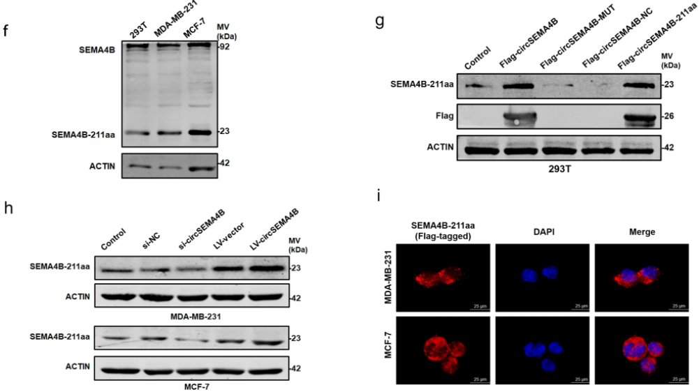 作者通过双荧光素酶验证了IRES的活性,随后通过构建翻译载体,证明了CircSEMA4B的ORF在MDA-MB-231和MCF-7细胞中是可翻译的,预测CircSEMA4B编码一个211a的新蛋白,命名为SEMA4B-211aa。作者针对SEMA4B-211aa构建了一种抗体,通过Western blotting证明了内源性翻译蛋白SEMA4B-211aa的存在。IF结果显示SEMA4B-211aa主要定位于BC细胞的细胞质中。