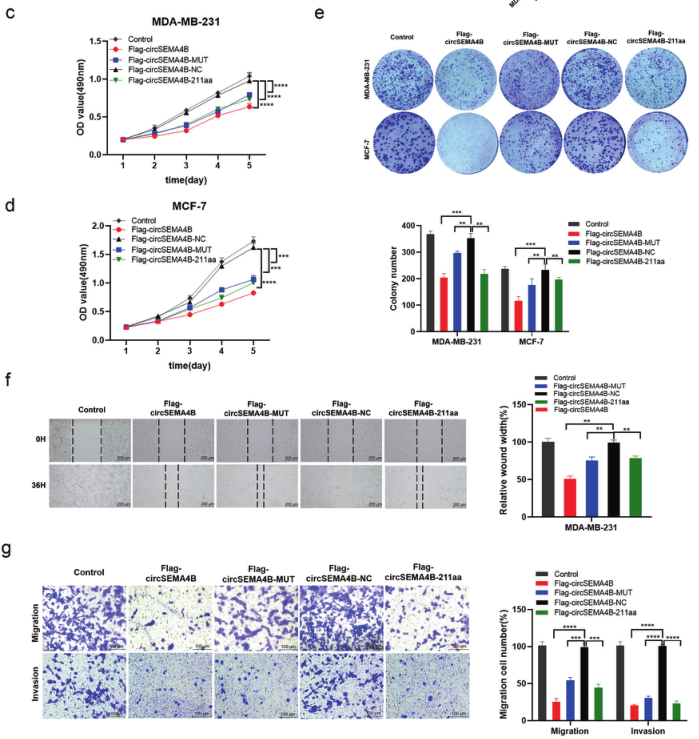 图4.CircSEMA4B和SEMA4B-211aa均在BC中发挥抑瘤作用