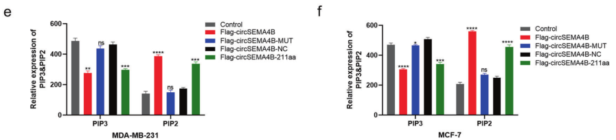 此外,作者在敲除和过表达CircSEMA4B后,SEMA4B的mRNA和蛋白水平没有明显变化,说明CircSEMA4B发挥其作用独立于其亲本基因。由此作者推断SEMA4B-211aa发挥作用于p110上游。然后,作者检测SEMA4B-211aa是否在转录水平上降低p110的表达。与蛋白质水平不同,p110的mRNA水平不受SEMA4B-211aa的影响,表明p110蛋白的减少发生在转录后阶段。