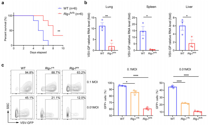 图2.RIG-Ifs/fs小鼠对实验性结肠炎的易感性增加3、RIG-I的移码突变通过促进I型IFN的产生限制病毒的复制