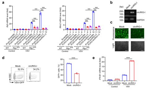 首先,作者利用RNAfold web预测RIG-I基因的RNA结构,发现移码突变能够损坏其RIG-I前体RNA的二级结构。随后作者通过查阅已经发表的DHX9基因的CLIP-seq数据,发现DHX9作为调控环状RNA生成的关键蛋白,能够富集在RIG-I基因的Alu SINEs原件上。随后,作者也通过RNA-pulldown证实RIG-I与DHX9之前存在互作。而RIG-I的移码突变显著降低了其与DHX9的结合。由于DHX9在调控环状RNA生物发生中具有重要的作用,因此作者假设RIG-I的移码突变可以触发RIG-I转录本生成环状RNA。不出所料,作者通过RNA-seq鉴定到来源于RIG-I基因第5和12外显子的环状RNA并将其命名为CircRIG-I。该环状RNA主要存在于细胞质中,且在感染病毒的RIG-Ifs/fsMEFs中显著增加。以上结果表明,RIG-I的移码突变触发了CircRIG-I的产生。
