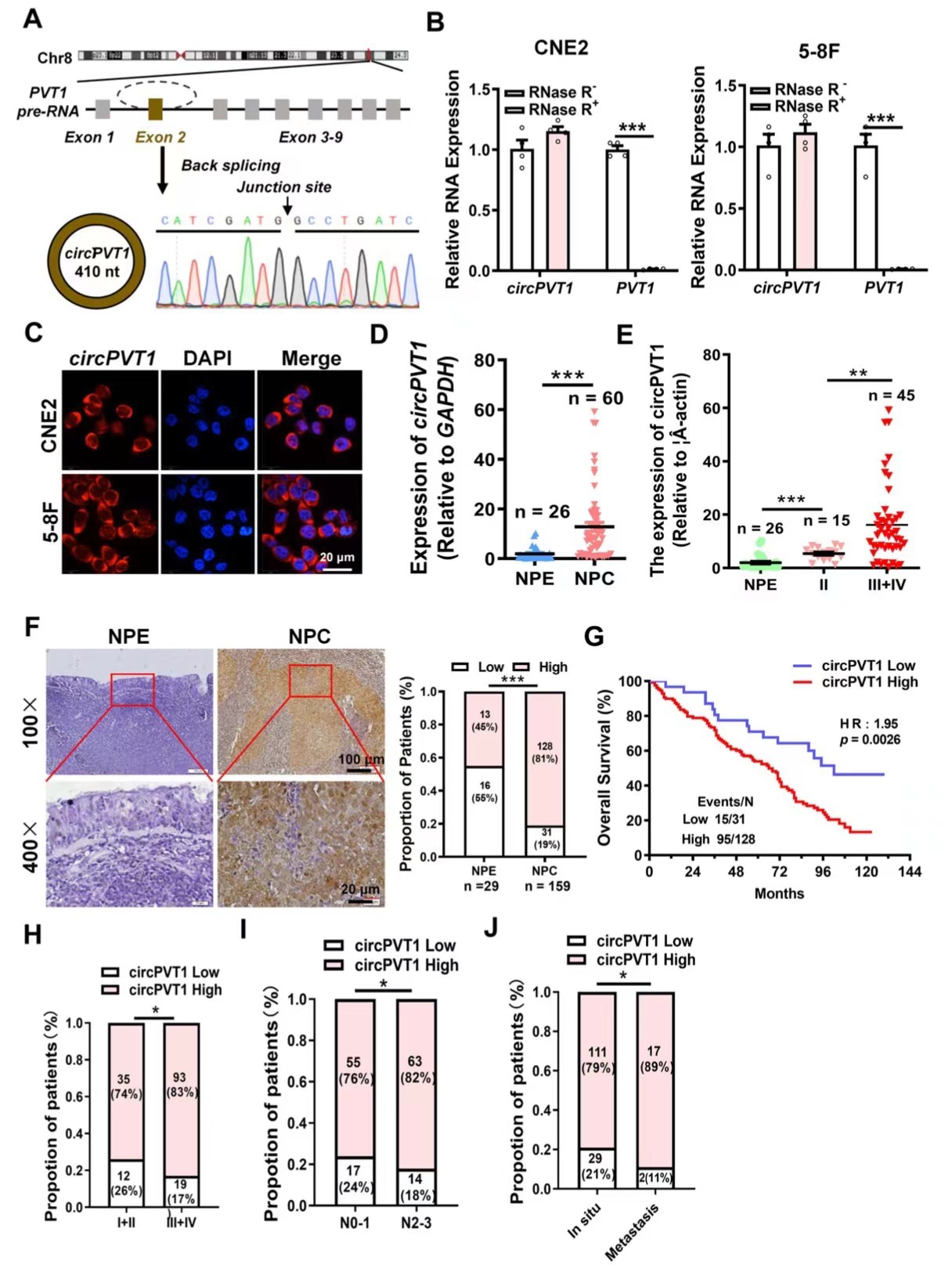 图1. circPVT1在鼻咽癌中高表达并导致预后不良