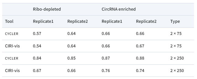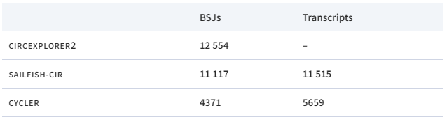该结果仅基于两种工具正确识别的转录本数量,通过这种方式来判断这些程序的输出以及组装精度对转录本量化的影响。CYCLER是目前唯一一种同时量化已知线性和新组装的环状转录本的方法。