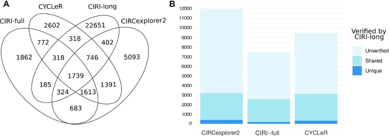 作者观察到,与其他基于Illumina的工具相比,CIRCexplorer2 输出的isoform数量非常多。CIRCexplorer2确实提供了最多数量的和CIRI-long共有的isoform;然而,来自CIRCexplorer2的未经CIRI-long验证的isoform数量也高得不成比例。