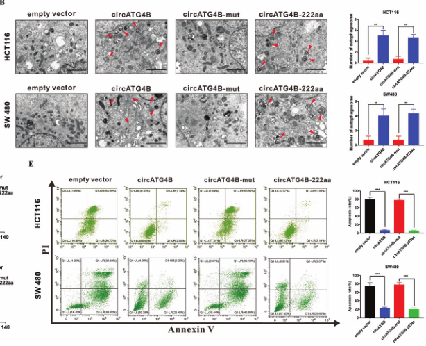 作者通过将上述4种载体体外转染到CRC细胞中发现,仅转染circATG4B或circATG4B-222aa过表达载体后,自噬增加,CRC细胞耐药性增加;另外,作者又在体内小鼠中做皮下注射稳转四种载体细胞,结果同体外实验相同。这些结果表明,能够编码circATG4B-222aa的载体才可增加自噬水平,诱导细胞L-OHP 耐药。