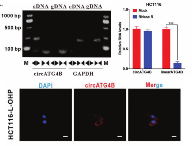 ATG4B在各种癌症中的自噬诱导功能,已被报道与化疗耐药有关[2]。因此,作者在circBase找到15个ATG4B,并从中发现circATG4B(hsa_circ_0007159)在L-OHP 耐药患者的CRC组织以及耐药CRC细胞系中明显上调。背靠背引物验证/R酶处理/FISH验证circATG4B成环/稳定/定位胞质。这些结果表明circATG4B稳定存在,并与CRC患者的L-OHP 反应密切相关。
