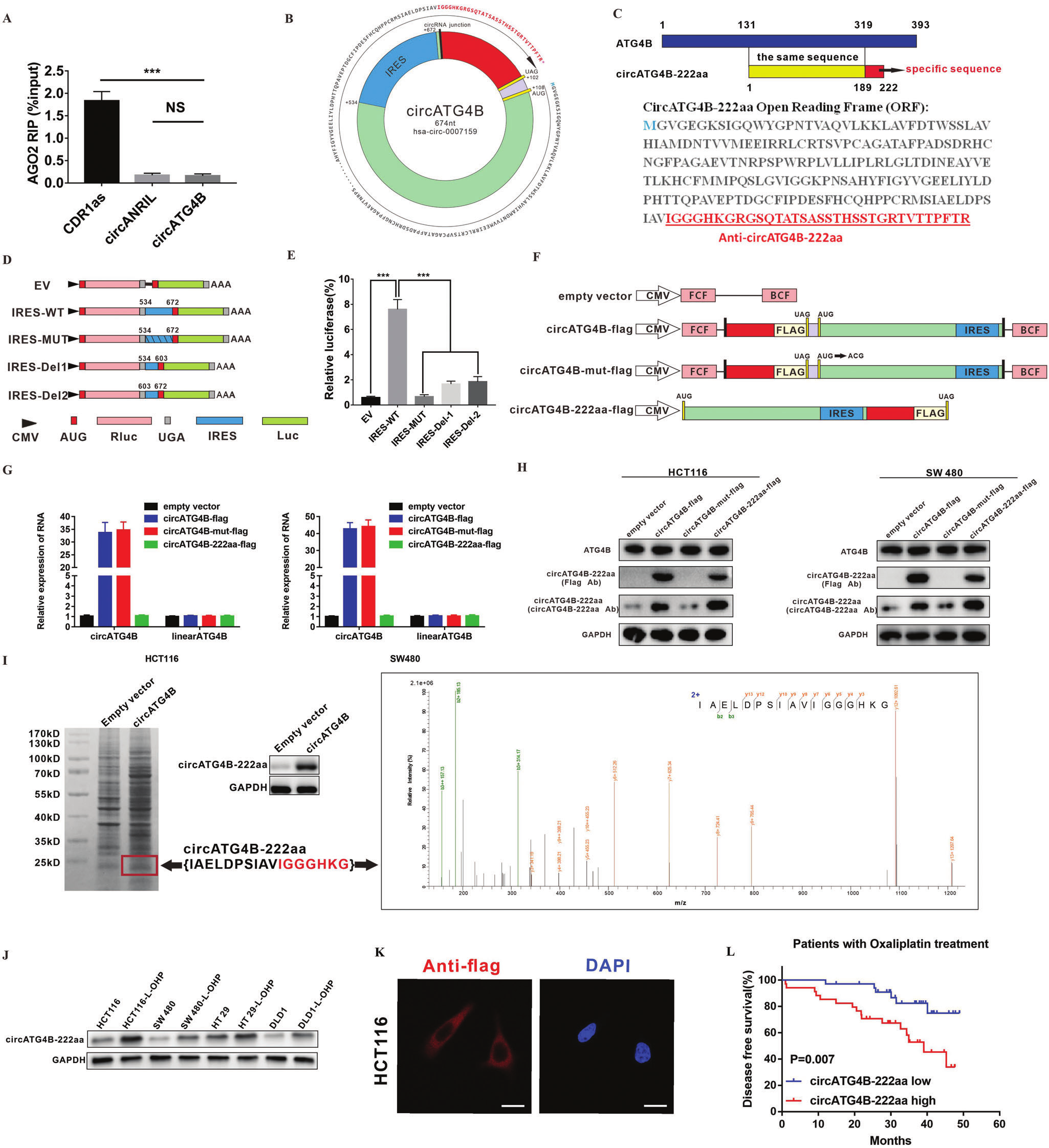 MicroRNA (miRNA)海绵作用是circRNA最常见的功能。然而,RIP结果显示circATG4B与AGO2无关,这表明circATG4B可能通过不同的机制发挥其功能。越来越多的证据表明,一些circRNA能够编码新的蛋白质。通过查阅circRNA Db发现,circATG4B有一个669nt的ORF,有可能编码222个氨基酸的蛋白质,并且其中有一段包含33个氨基酸的新序列。作者在ORF中发现534nt-672nt处有一个IRES,并用双荧光素酶法验证了circATG4B中IRES具有活性。随后,作者构造了四个不同的载体(阴性空载对照/带Flag标签载体/突变起始密码子+Flag标签阴性载体对照/线性阳性载体对照),又研发了一种新的抗体(特异识别circATG4B-222aa),用qPCR和WB证实circATG4B-222aa能够被翻译出来。最后,通过SDS-PAGE分离转染了circATG4B细胞的总蛋白,然后将大小接近24kd的蛋白条带切除并提交质谱分析,发现了circATG4B的剪接位点处所形成的独特肽序列(IAELDPSIAVIGGGHKG),表明circATG4B可以编码一种新的蛋白质。此外,在接受L-OHP 治疗的CRC患者中,circATG4B-222aa表达与不良预后呈正相关,这提示circATG4B-222aa可能是L-OHP 耐药细胞的预后标志物。