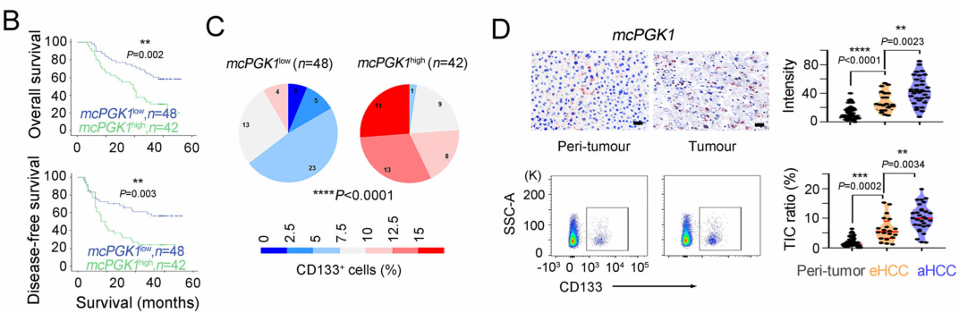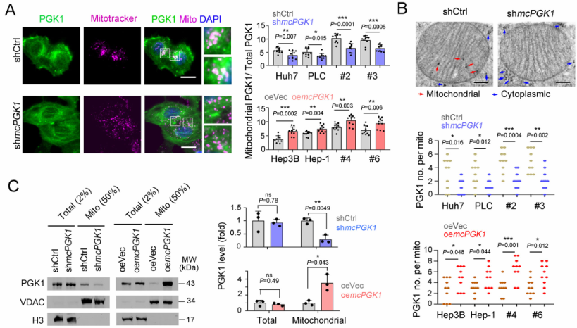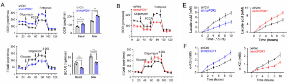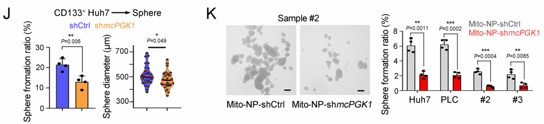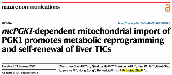 肝癌是一种常见的肿瘤类型,由于其异质性,导致很多肝癌患者预后效果极差。肝脏肿瘤起始细胞(TICs)有助于肿瘤的转移、生长和耐药。代谢改变是癌症的标志,在肝脏肿瘤发生过程中起着重要作用。然而,代谢改变在TIC中的作用仍未得到充分的研究。环状RNA (circRNAs)是一种新发现的调控RNA分子,在多种生物过程中发挥着重要的调节作用,如作为miRNA的分子海绵、调节因子和发挥RBP功能等等[1]。越来越多的证据表明,线粒体中的circRNA参与肿瘤细胞和TICs的自我更新。然而,迄今为止,线粒体编码的circRNA在肿瘤发生和TIC中的功能和调控机制尚不清楚。2023年1月,郑州大学生命科学学院朱平平教授课题组在Nature子刊Nature Communications发表文章mcPGK1-dependent mitochondrial import of PGK1 promotes metabolic reprogramming and self-renewal of liver TICs。作者鉴定了一种肝脏TICs中富集的线粒体编码的环状RNA——mcPGK1。其下调会损害肝脏TICs的自我更新,而过表达则相反。在调节机制上,mcPGK1通过抑制线粒体氧化磷酸化(OXPHOS)和促进糖酵解进而调节代谢,改变细胞内α-酮戊二酸和乳酸(Wnt/β-catenin激活和肝脏TICs自我更新的调节剂)的水平。此外,mcPGK1与TOM40的互作通过PGK1-PDK1-PDH轴从氧化磷酸化到糖酵解促进PGK1进入线粒体。文章解析了线粒体编码的circRNA调控线粒体功能、代谢和肝脏TICs自我更新的机制。mcPGK1在肝脏TICs中高表达首先,作者在肝脏TICs和非TICs中筛选出差异表达的6个mecircRNA,经过R酶消化、PCR和DNA测序鉴定均为circRNA。通过成球测试,作者选择mecirc8(mcPGK1)进行下一步分析。R酶消化验证mcPGK1稳定性,FISH验证其定位细胞质;mcPGK1在肝脏肿瘤中富集,并主要富集在线粒体外膜和基质中。mcPGK1的表达与临床分期、肿瘤体积、复发和生存相关。综上所述,线粒体编码的mcPGK1在肝脏TICs中稳定表达。图1.mcPGK1在肝脏TICs中高表达mcPGK1驱动肝脏TICs的自我更新作者评估了mcPGK1在肝脏TICs中的功能。敲低mcPGK1降低成球和增殖能力,过表达促进肝脏TICs的增殖和肿瘤生长。作者还针对线粒体mcPGK1构建了靶向纳米颗粒—shmcPGK1,在肝脏TICs上应用结果显示,成球能力受损。同样针对线粒体mcPGK1构建了靶向纳米颗粒—过表达mcPGK1,在肝脏TICs上应用结果与shmcPGK1相反。这些结果表明mcPGK1是肝脏TICs自我更新所必需的。图2. mcPGK1驱动肝脏TICs的自我更新mcPGK1改变OXPHOS到糖酵解的代谢过程线粒体的核心功能是能量代谢,作者评估了mcPGK1对OXPHOS和糖酵解的影响。在mcPGK1敲低的细胞中,OXPHOS活性增强,代谢产物增加,糖酵解活性减弱,而mcPGK1过表达则相反,这表明mcPGK1改变了OXPHOS转向糖酵解的代谢进程。作者随后测定了糖酵解和OXPHOS的两种主要代谢产物——乳酸和α-KG的表达。mcPGK1过表达情况下,乳酸迅速积累,但在mcPGK1敲低中没有;mcPGK1敲低的情况下,α-KG迅速积累,但在mcPGK1过表达中没有。这些数据表明mcPGK1改变了代谢过程。图3. mcPGK1改变OXPHOS到糖酵解的代谢过程Wnt信号调控mcPGK1的代谢变化来增强肝脏TICs功能乳酸促进肝脏TICs的自我更新和相关基因的表达,而α-KG具有相反的作用。二者可作为肝脏TICs的调控因子。作者又用FX-11(乳酸生成抑制剂,可抑制肝脏肿瘤的传播),验证了乳酸在肝脏TICs的作用。这些结果证实了代谢变化参与了肝脏TICs的生长。实验结果发现,乳酸和α-KG都以Wnt/β-catenin通路为靶点,而Wnt/β-catenin是影响肝脏TIC功能的关键信号通路。mcPGK1过表达增强的成球可被Wiki4或LF3抑制;mcPGK1过表达增加的乳酸也增强Wnt/β-catenin信号,而α-KG则相反,β-catenin(Wnt信号关键靶标)表达的结果也证明了这一结果。这些结果表明mcPGK1通过Wnt/β-catenin途径发挥作用。随后作者又用乳酸通过增强lnc-β-catm(可促进β-catenin的甲基化)表达促进β-catenin稳定,用α-KG通过H3K4me3去甲基化酶JARID1B抑制了β-catenin的转录,佐证了mcPGK1影响的乳酸和α-KG通过Wnt信号促进肝脏TICs生长。图4. Wnt/β-catenin介导乳酸和α-KG调控TICs生成mcPGK1与PGK1和TOM40互作,并促进PGK1与TOM40复合物互作circRNA Pulldwn被用于探索mcPGK1的分子机制。PGK1、TOM40和TOM70在下拉蛋白中,表明在肝脏TICs中与mcPGK1结合;WB也佐证这一结果。PGK1作为糖酵解和OXPHOS的关键调控因子,被选中用于机制探索,并再度验证出与mcPGK1互作。此外,作者发现,PGK1与TOM40/TOM70(可形成蛋白进入线粒体的通道)也存在互作,也就意味着mcPGK1同PGK1与TOM40/TOM70三者均有互作并发挥功能。不过,过表达mcPGK1可促进PGK1与TOM40/TOM70的结合,敲低mcPGK1则相反;作者突变了mcPGK1的不同位点验证了这种影响可能发生在特定位点(HR#2)。总而言之,mcPGK1与PGK1和TOM40互作,并促进PGK1与TOM40复合物互作。图5. mcPGK1促进PGK1与TOM40复合物的结合mcPGK1驱动PGK1进入线粒体PGK1在细胞质中表达,但在肿瘤发生过程中经常被转移到线粒体。作者发现,mcPGK1过表达促进PGK1进入线粒体,而敲低mcPGK1则相反;电镜的结果与之保持一致;并且敲除mcPGK1降低了PDH的磷酸化。这表示,mcPGK1-PGK1-PDK1介导的PDH磷酸化抑制了PDH将丙酮酸转化为乙酰辅酶a的功能,从而改变了从OXPHOS到糖酵解的代谢。最后作者评估了PGK1-PDK1-PDH轴在mcPGK1功能中的作用。纳米颗粒技术驱动PGK1进入线粒体后,可在很大程度上削弱mcPGK1敲低的作用;此外,过表达mcPGK1在抑制PDK1表达的条件下,成球的促进作用被限制,这表明mcPGK1驱动PGK1进入线粒体,然后发挥作用。综上表示,mcPGK1通过PGK1-PDK1-PDH途径驱动PGK1进入线粒体,抑制OXPHOS并促进糖