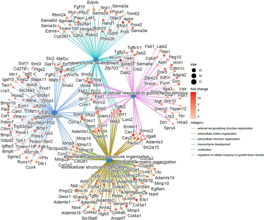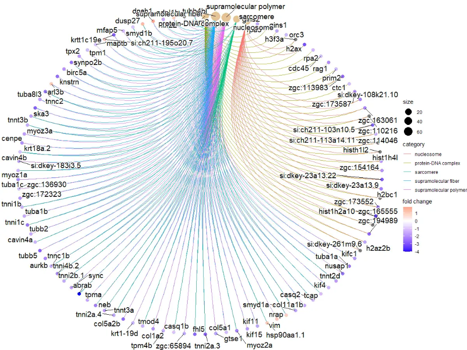 小编:这是用R包enrichplot内置的cnetplot函数绘制出来的,它将基因与它们所富集到的功能通路之间的复杂联系用网络图清晰地展现出来,同时还展示了基因的差异表达变化,和“弦图”有异曲同工之处。