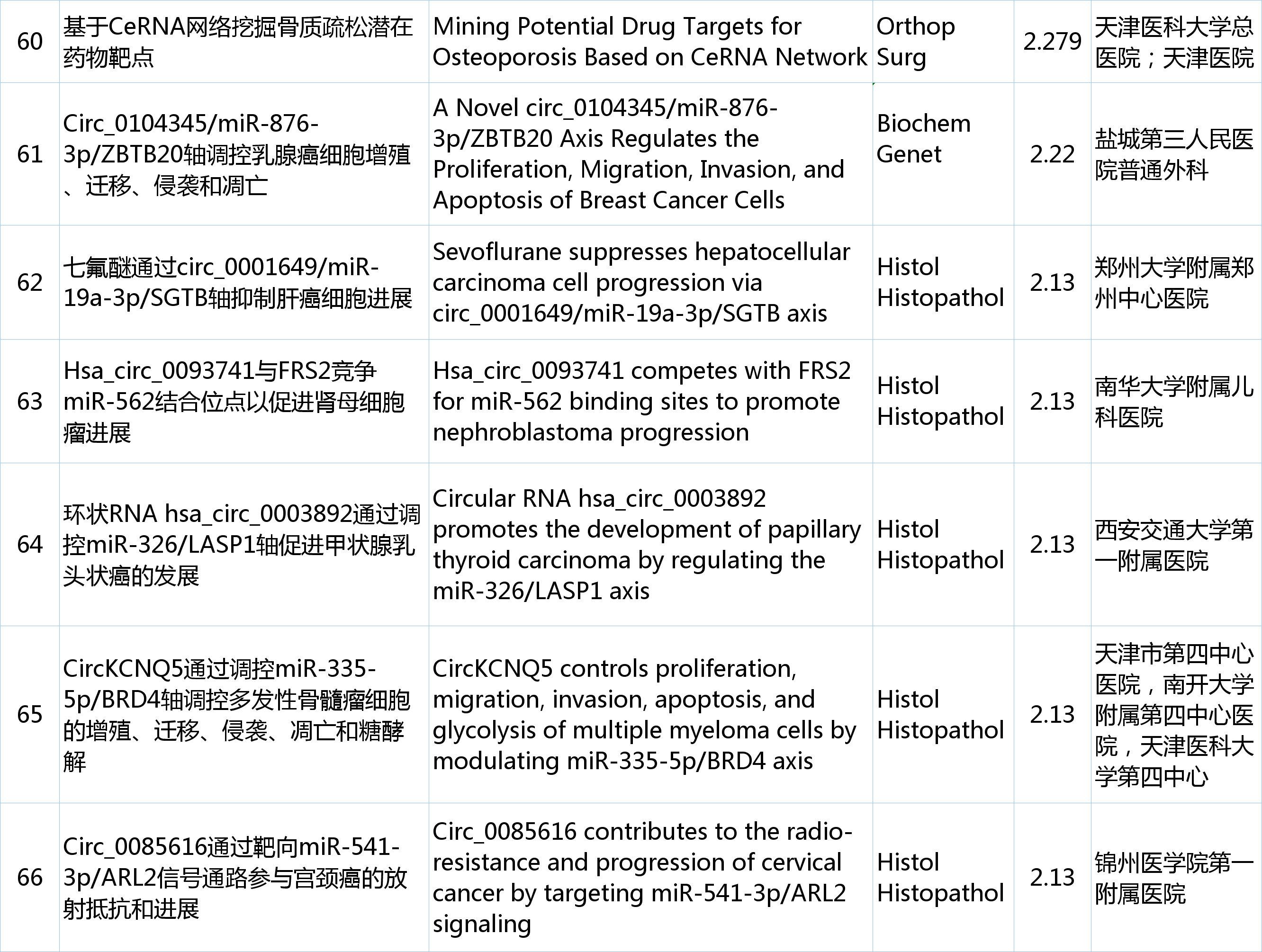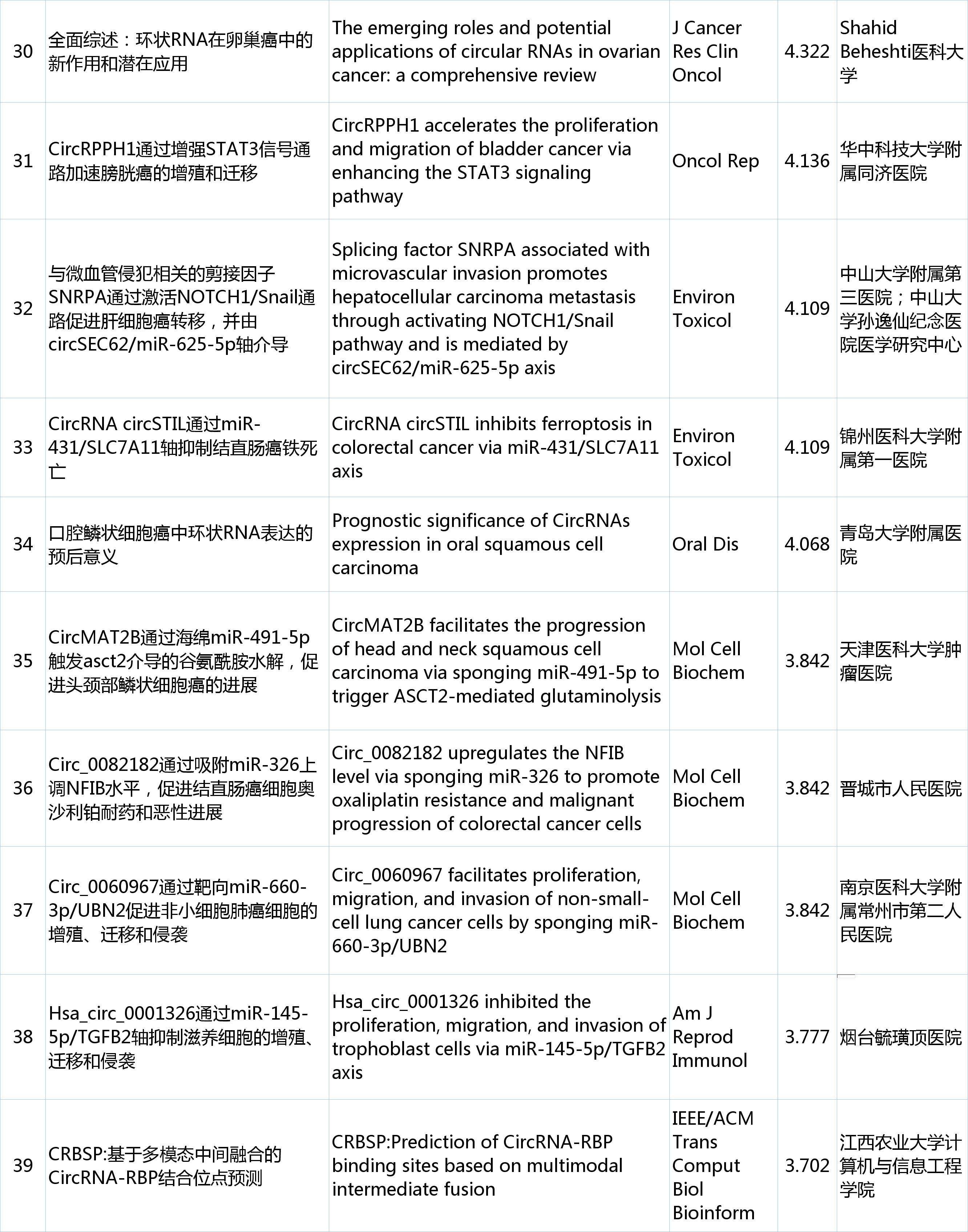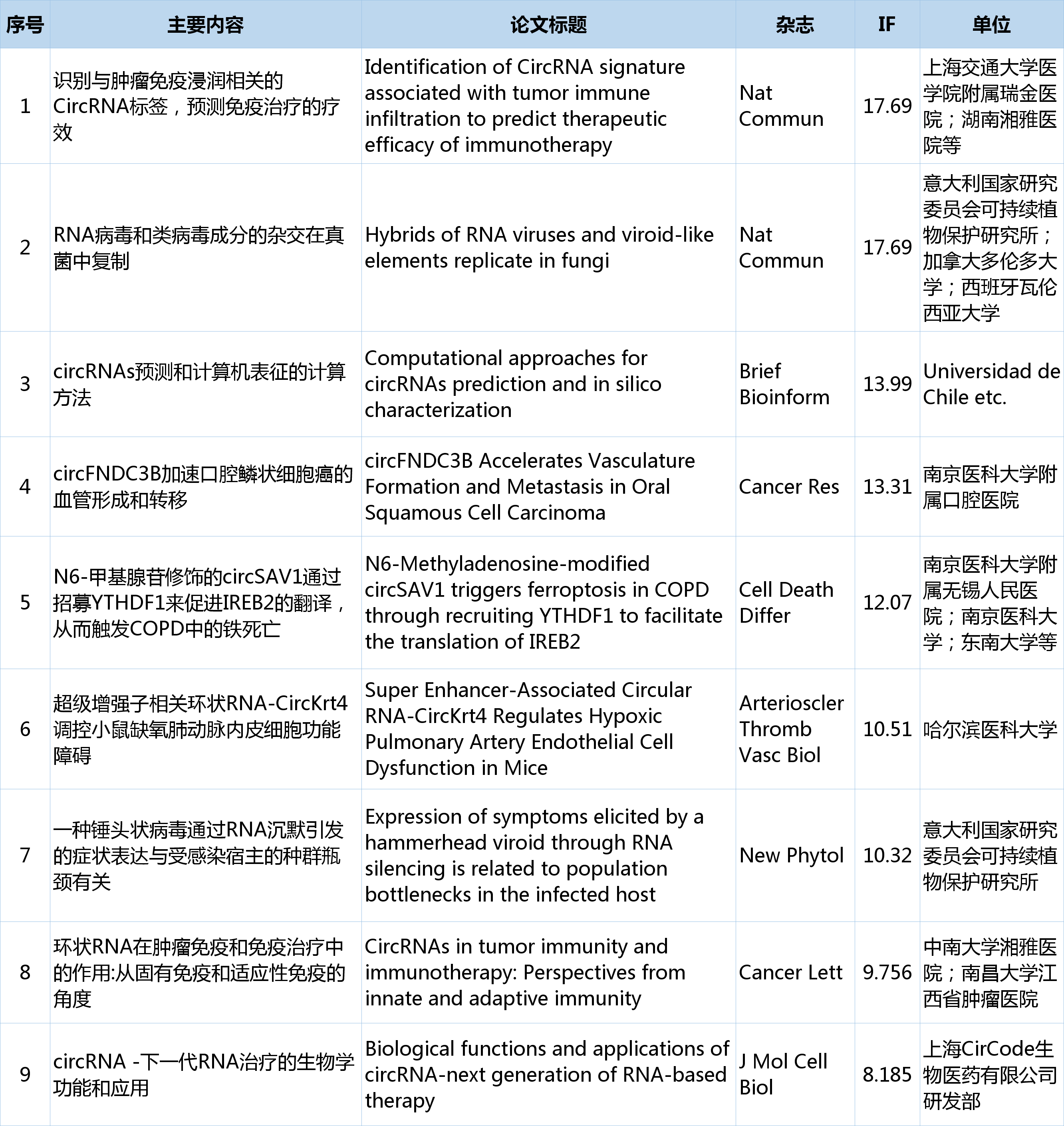 欢迎各位来到“circRNA研究汇总”栏目,本期从pubmed中检索收集最新发布的circRNA文献共计66篇,现在让我们一起看看circRNA研究最近有哪些新进展。 检索式:(circRNA[Title/Abstract]) OR circular RNA[Title/Abstract] 研究汇总列表 分类: circRNA与疾病, 前沿动态, 最新重要进展, 每周进展汇总, 研究热点跟踪admin五月 8, 2023评论