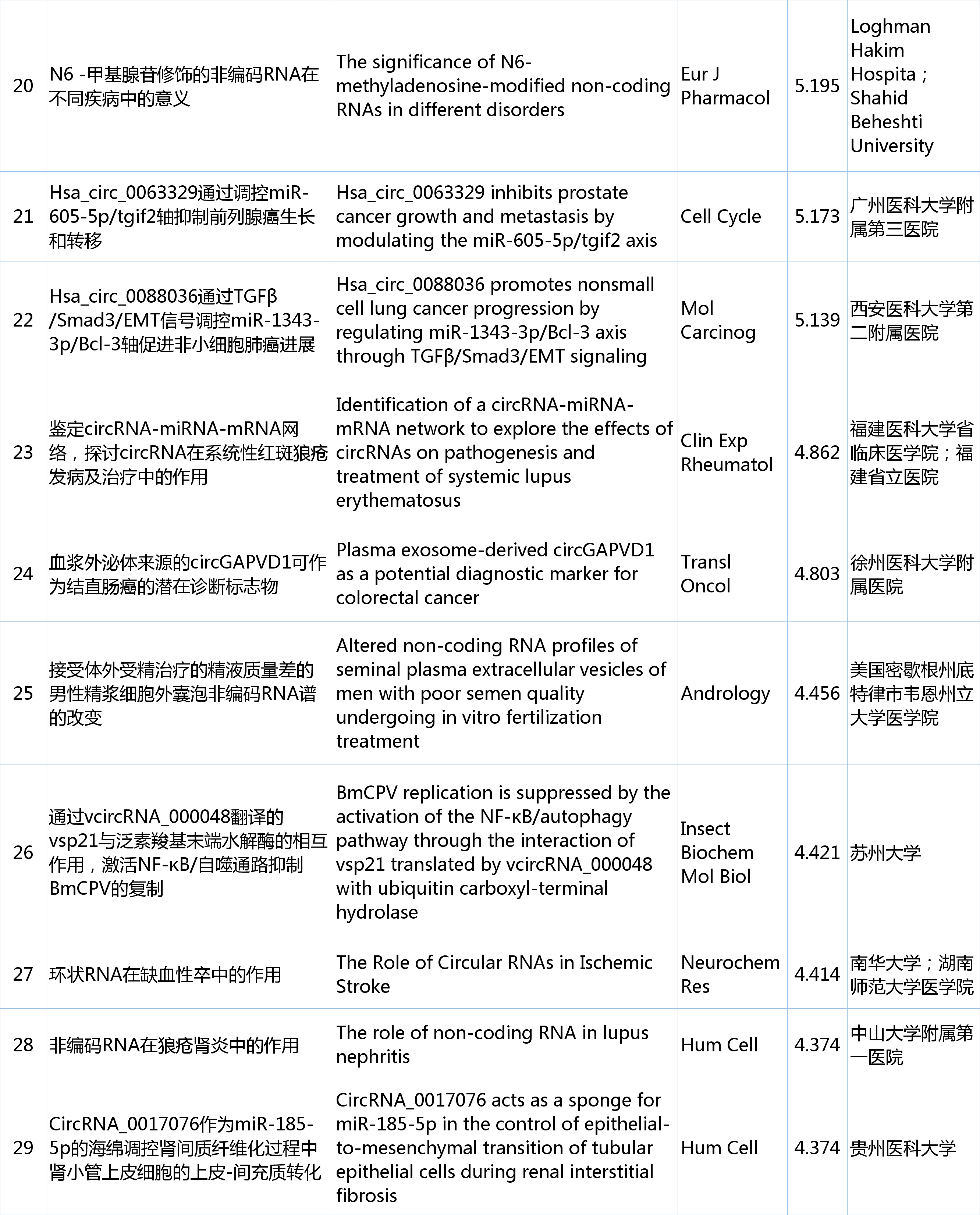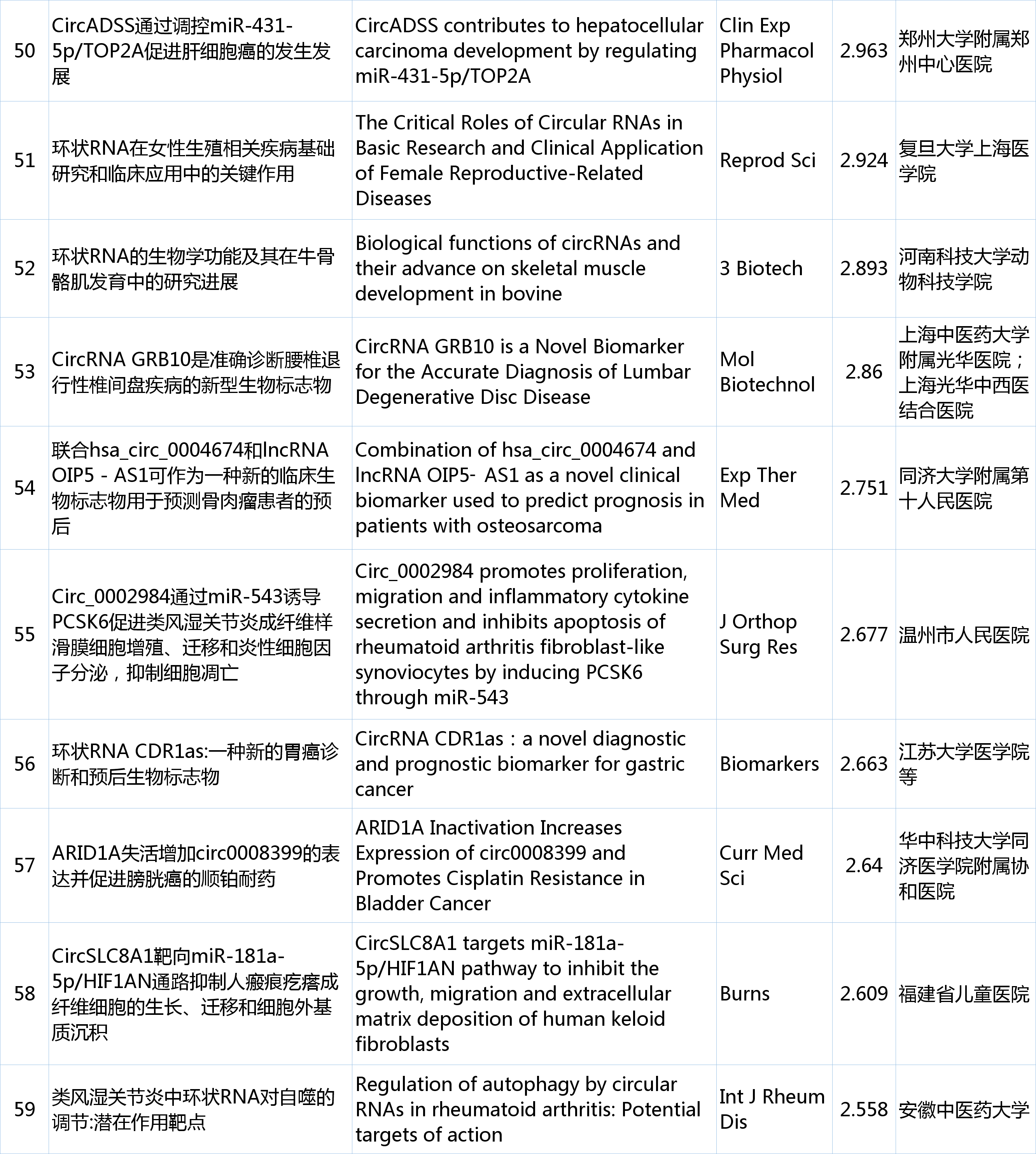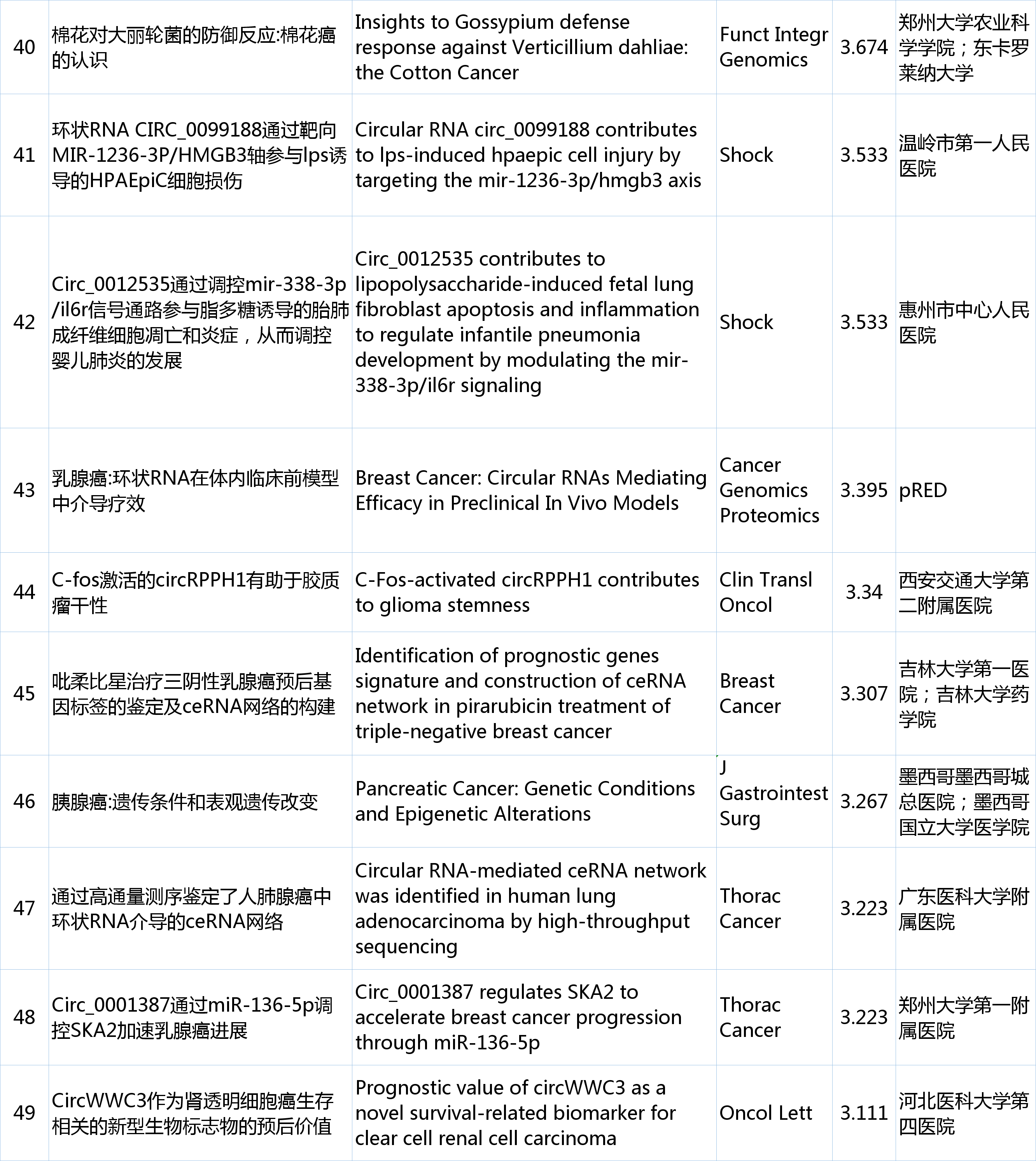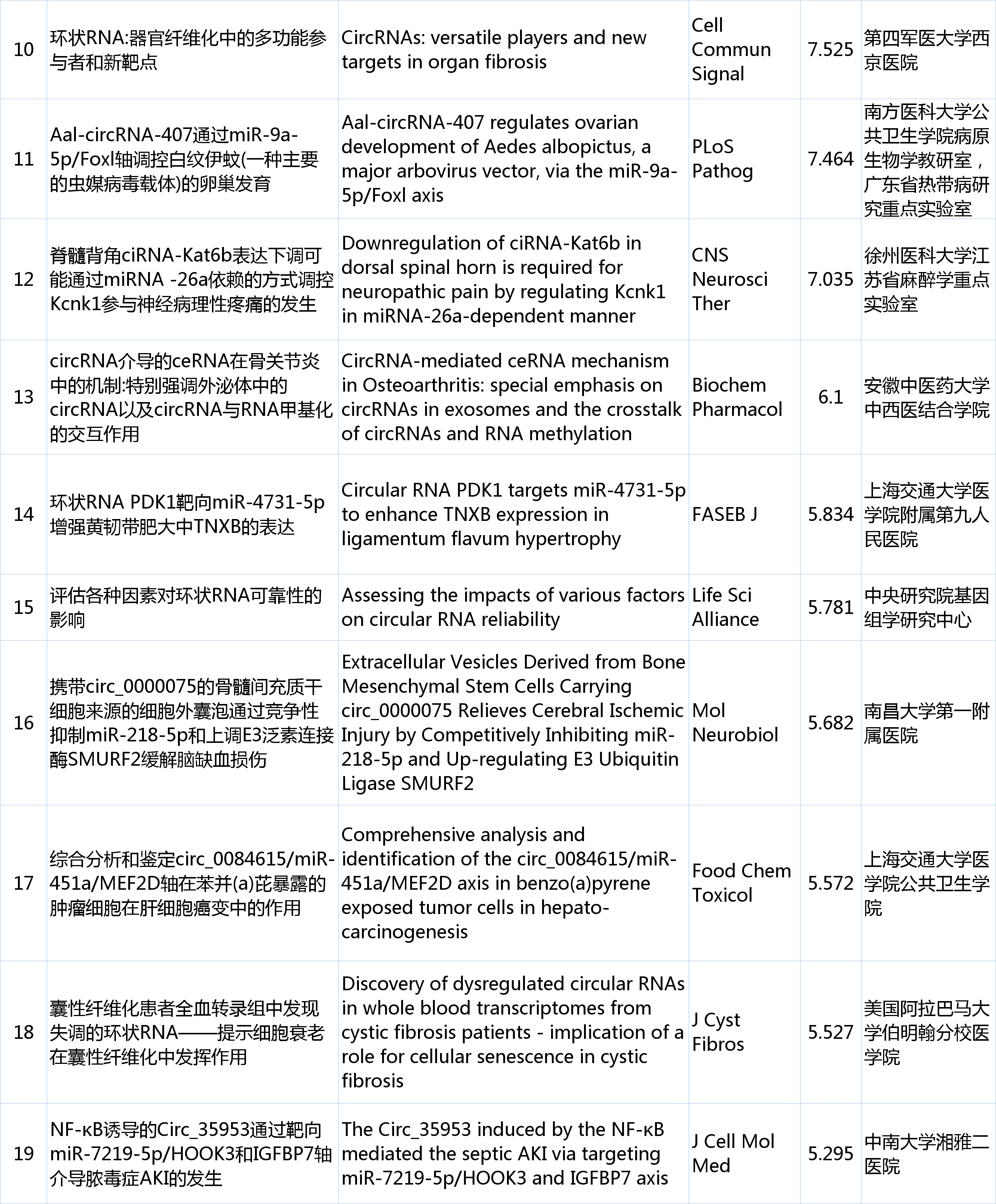 欢迎各位来到“circRNA研究汇总”栏目,本期从pubmed中检索收集最新发布的circRNA文献共计66篇,现在让我们一起看看circRNA研究最近有哪些新进展。 检索式:(circRNA[Title/Abstract]) OR circular RNA[Title/Abstract] 研究汇总列表 分类: circRNA与疾病, 前沿动态, 最新重要进展, 每周进展汇总, 研究热点跟踪admin五月 8, 2023评论