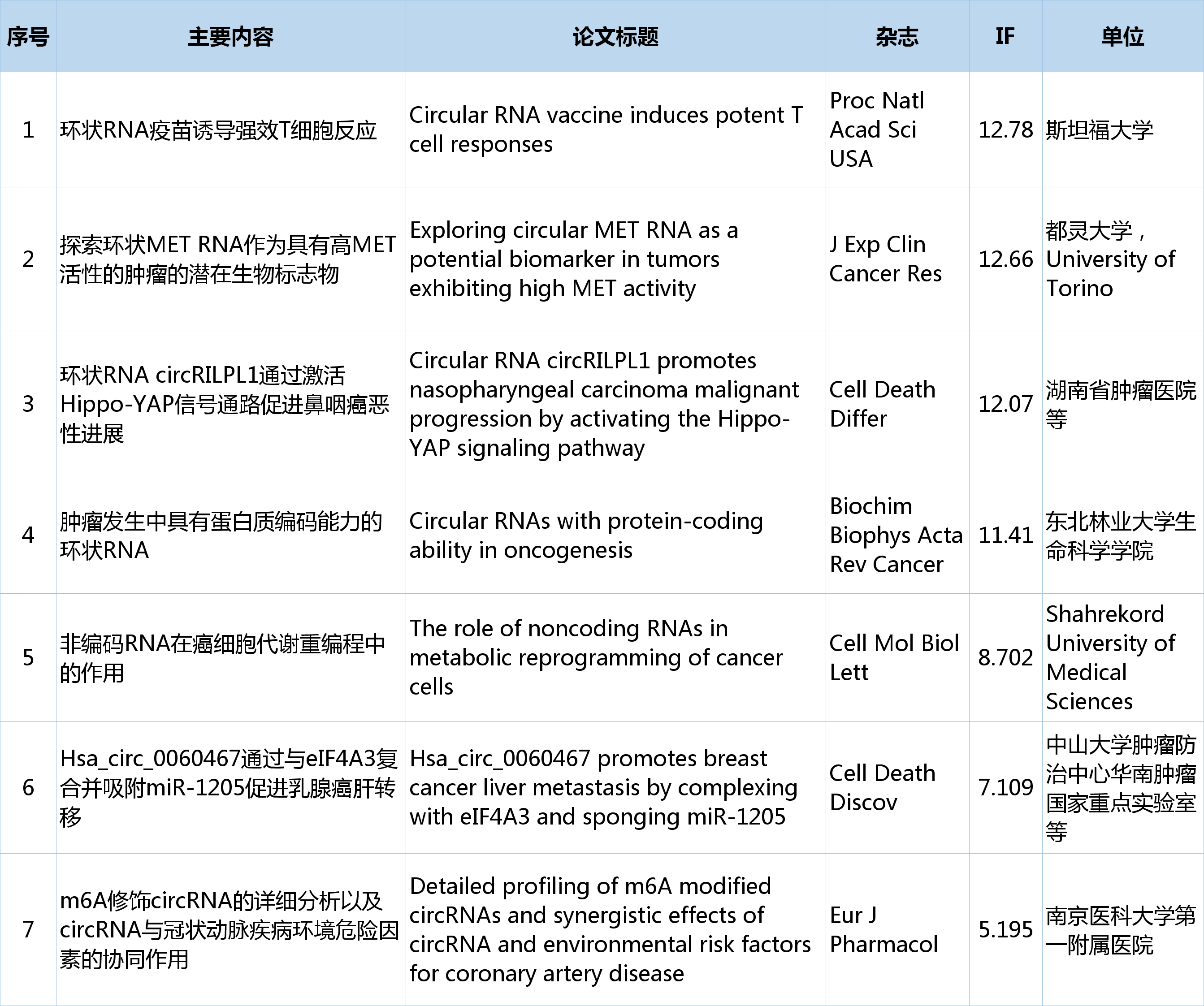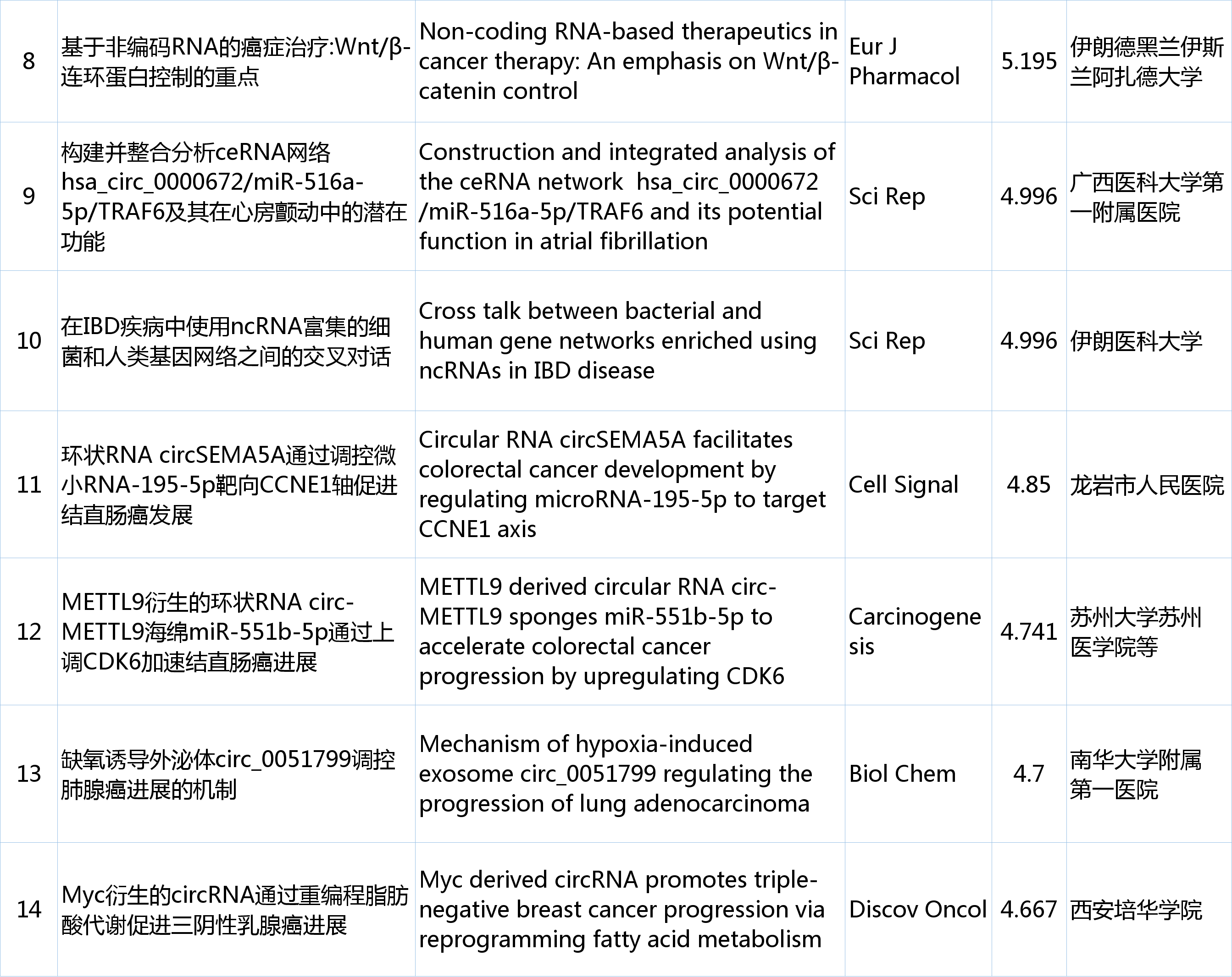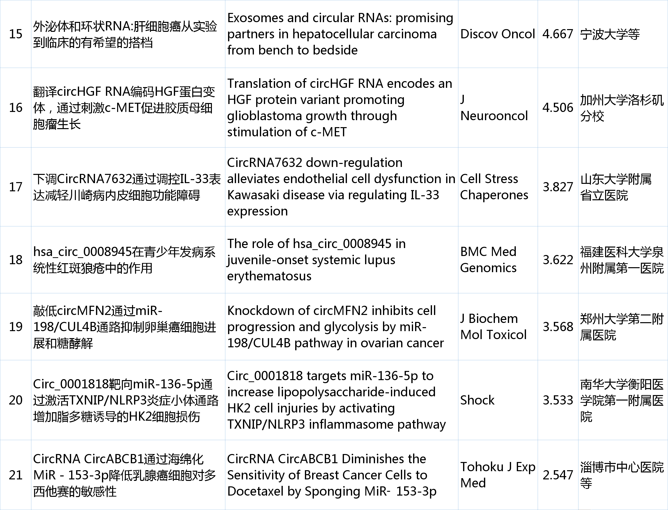 欢迎各位来到“circRNA研究汇总”栏目,本期从pubmed中检索收集最新发布的circRNA文献共计21篇,现在让我们一起看看circRNA研究最近有哪些新进展。 检索式:(circRNA[Title/Abstract]) OR circular RNA[Title/Abstract] 研究汇总列表 分类: circRNA与疾病, circRNA生物学, 前沿动态, 最新重要进展, 每周进展汇总, 研究热点跟踪admin五月 15, 2023评论