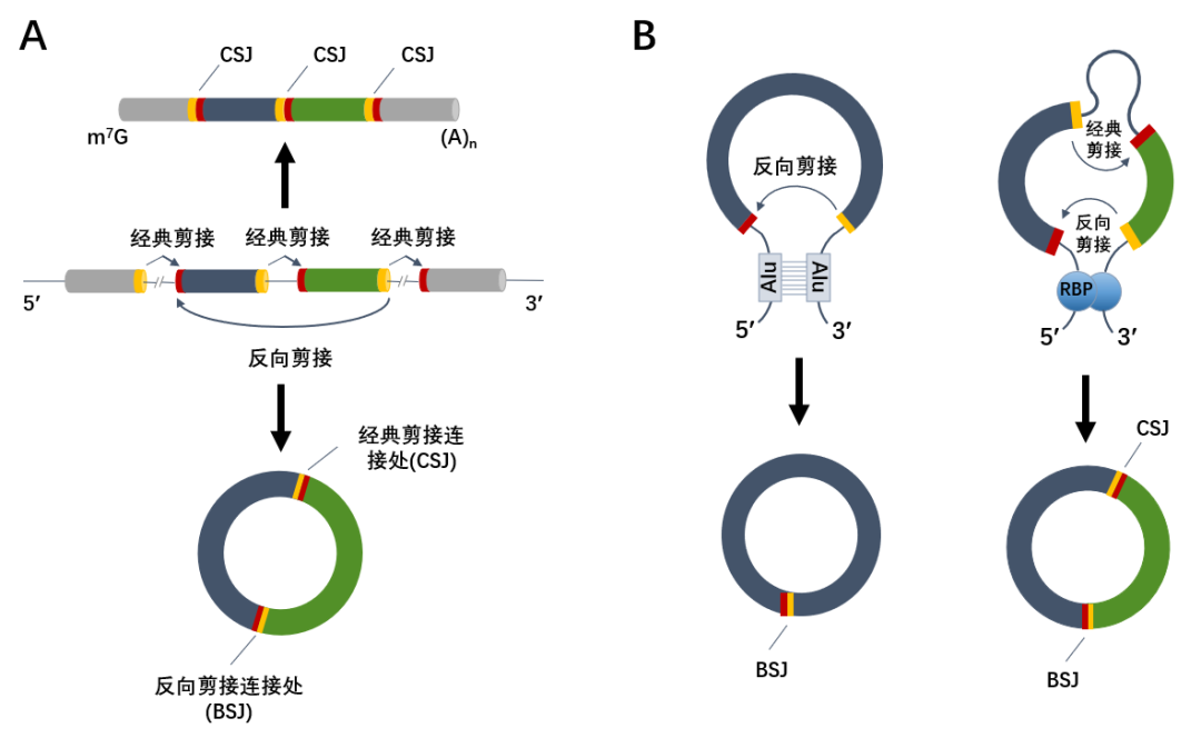 图1 反向剪接环化(A)和通过拉近外显子末端促进反向剪接(B)示意图