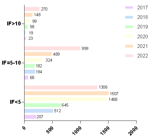 2022年,circRNA基础研究又上新台阶,在PubMed网站使用[Title/Abstract]限定范围检索“circRNA”或“circular RNA”,可检索相关文章共2575篇。有1200余篇影响因子大于5.0,其中270篇大于10.0,表明环状RNA基础研究水平快速提高(统计方法存在一定的局限性,数据仅供参考)。整体来看,circRNA基础研究在5-10和10以上的文章数较2021年均有近乎翻倍的增长,实现了在“质”和“量”上的大幅提升。(图3列举了2017-2022年间每一年在不同影响因子范围内所发表的文章数目)