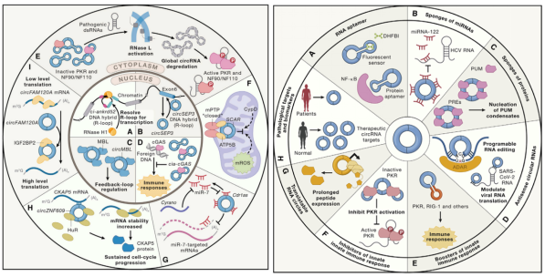 circRNA的研究主要体现在出核机制、内含子来源的circRNA定位胞质、反式拼接产物与circRNA的关系、病毒circDNA基因组表达circRNA产物、环状RNA(Cia-cGAS)参与造血干细胞静息状态调控等等;