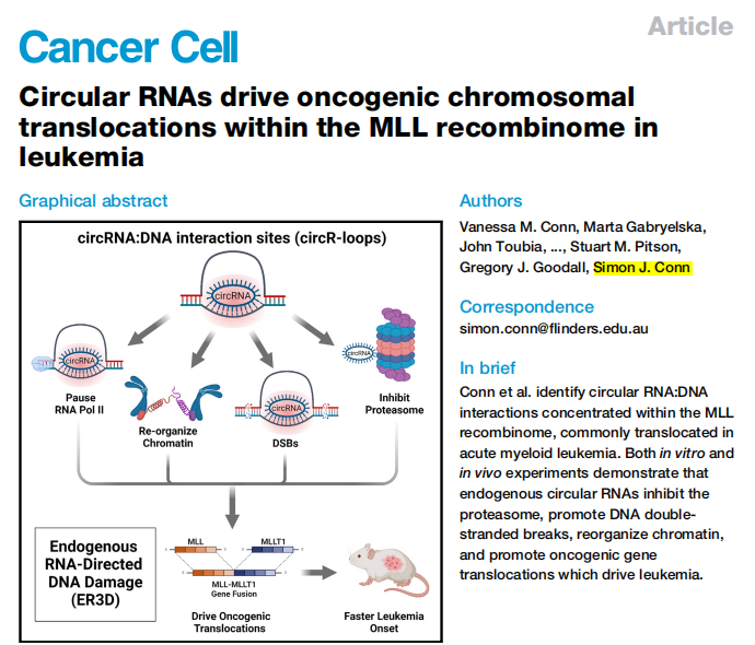 2023年6月,弗林德斯癌症创新中心的Simon Conn教授和Vanessa Conn博士团队在世界顶级癌症期刊之一的Cancer Cell(IF=38.585)上发表重磅文章Circular RNAs drive oncogenic chromosomal translocations within the MLL recombinome in leukemia。作者发现circRNA(circRNAs)在MLL重组体中富集,可结合DNA并在其同源位点形成circRNA-DNA杂交体(circR-loop)。这些circR-loop促进转录暂停、蛋白酶体抑制、染色质重组和DNA断裂。重要的是,在小鼠白血病异种移植模型中过表达circRNA会导致基因组的共定位(MLL重组体的染色体易位),从而诱发疾病。这些研究结果解析了白血病中内源性RNA染色体易位机制。