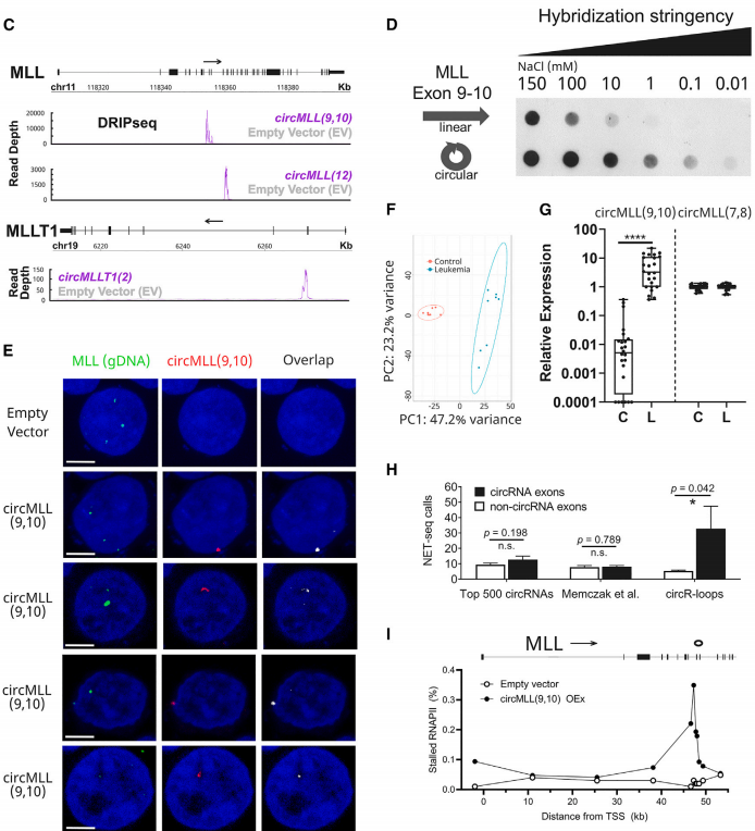 通过转录物分析,将对照和MLLr白血病进行分层,qRT-PCR来量化circRNA。与对照组相比,MLLr白血病患者样本中circRNA的丰度高出100倍以上。为了研究circR-loop是否促进转录暂停,作者从已发表的HEK293T NET-seq数据中检测了RNAPII占用率,该分析发现,与同一基因内的其他外显子相比,RNAPII在circR-loop附近(包括上游和下游内含子)富集,但在500个最丰富的circRNA中,和在与先前公布的HEK293T细胞的circRNA数据集相对应的部位,则没有这种情况。这表明RNAPII暂停在circR-loop附近富集,并不是circRNA转录的普遍特征。