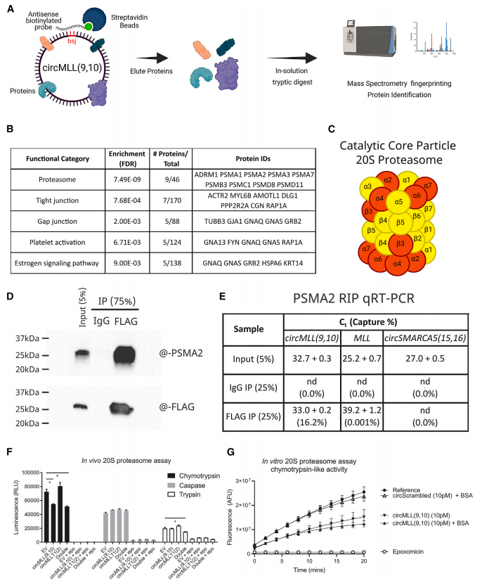 为了深入了解circMLL(9,10)暂停RNAPII并在同源和伴侣位点引起DSBs的能力机制,作者进行了circRNA免疫沉淀来分析circMLL(9,10)的蛋白质相互作用。KEGG分析发现蛋白酶体是最丰富的功能类别物。虽然每个蛋白都是较大的26S蛋白酶体的成分,但催化核心亚基20S蛋白酶体的14个亚基中有5个被circMLL(9,10)结合。