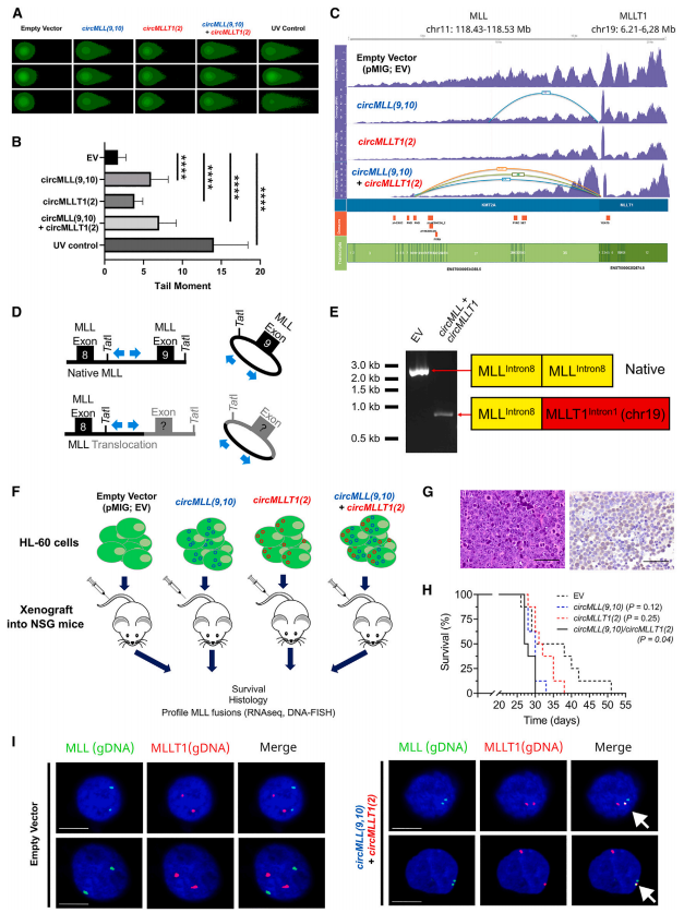 接下来,作者通过空载体对照、单个circMLL(9,10)和circMLLT1(2),或双circRNA过表达(circMLL(9,10)/circMLLT1(2))细胞异种移植到免疫功能低下的NOD.Cg-Prkdcscid Il2rgtm1Wjl/SzJ(NOD scid gamma)小鼠中,评估了circRNA过表达在体内的影响。Kaplan-Meier生存分析表明,与空载体对照相比,单独circRNA的过表达对这些小鼠的疾病发作没有显著影响;双过表达系显示出明显的疾病加速(p=0.04,log rank Mantel-Cox检验)。重要的是,作者使用MLL-MLLT1基因组DNA探针通过DNA-FISH证实,在circMLL(9,10)/circMLLT1(2)系中可以看到独特的融合。