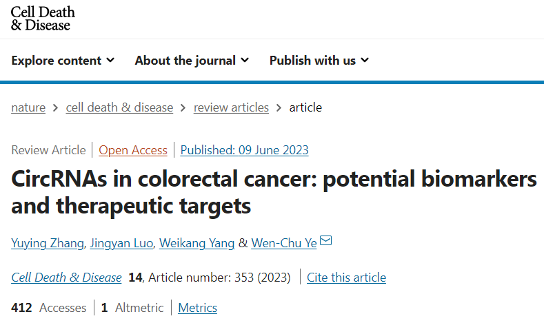 2023年6月9日,香港中文大学深圳研究院Wen-Chu Ye在Cell Death & Disease(IF=9.685)发表了综述文章CircRNAs in colorectal cancer: potential biomarkers and therapeutic targets。文章综述了circRNA在CRC的生物发生、表达特征和作用机制,重点介绍了circRNA作为CRC诊断和预后生物标志物以及作为CRC治疗靶点的潜在临床应用。