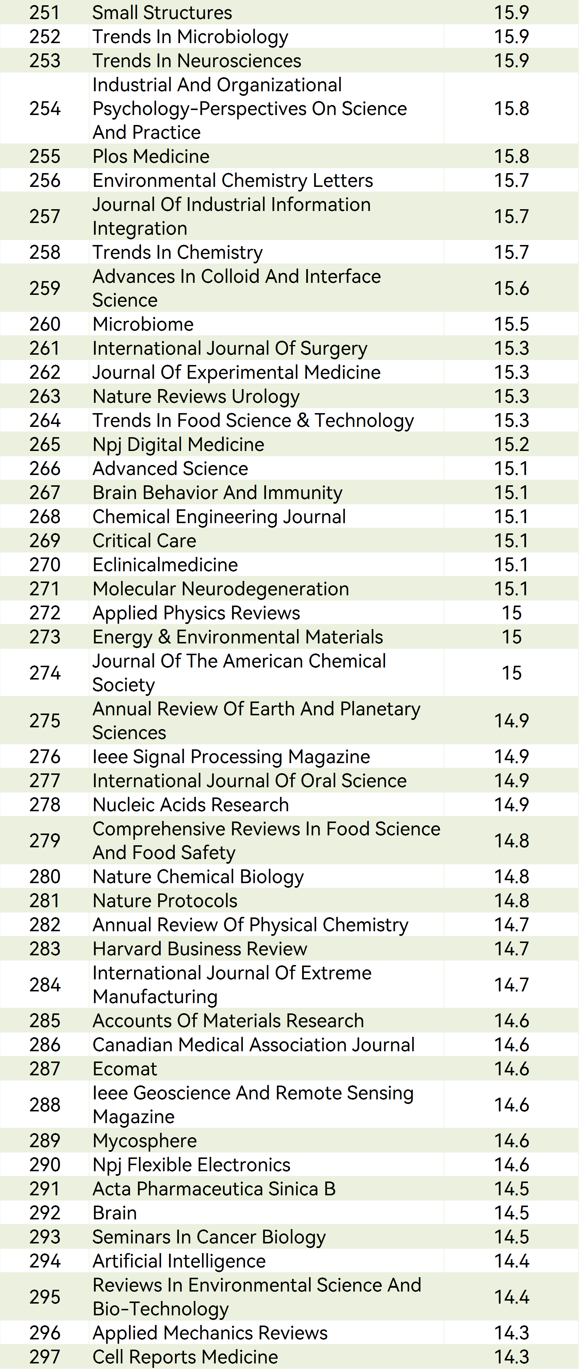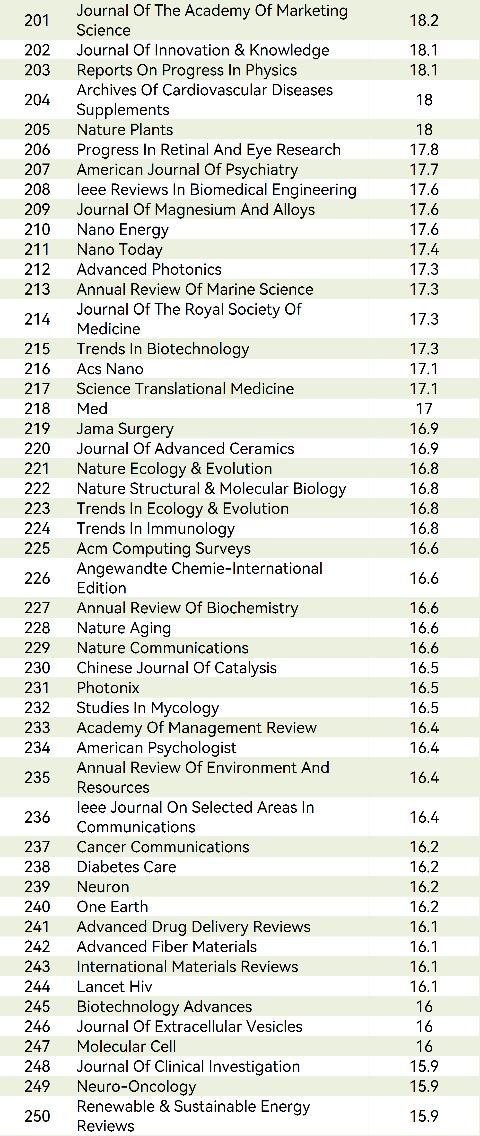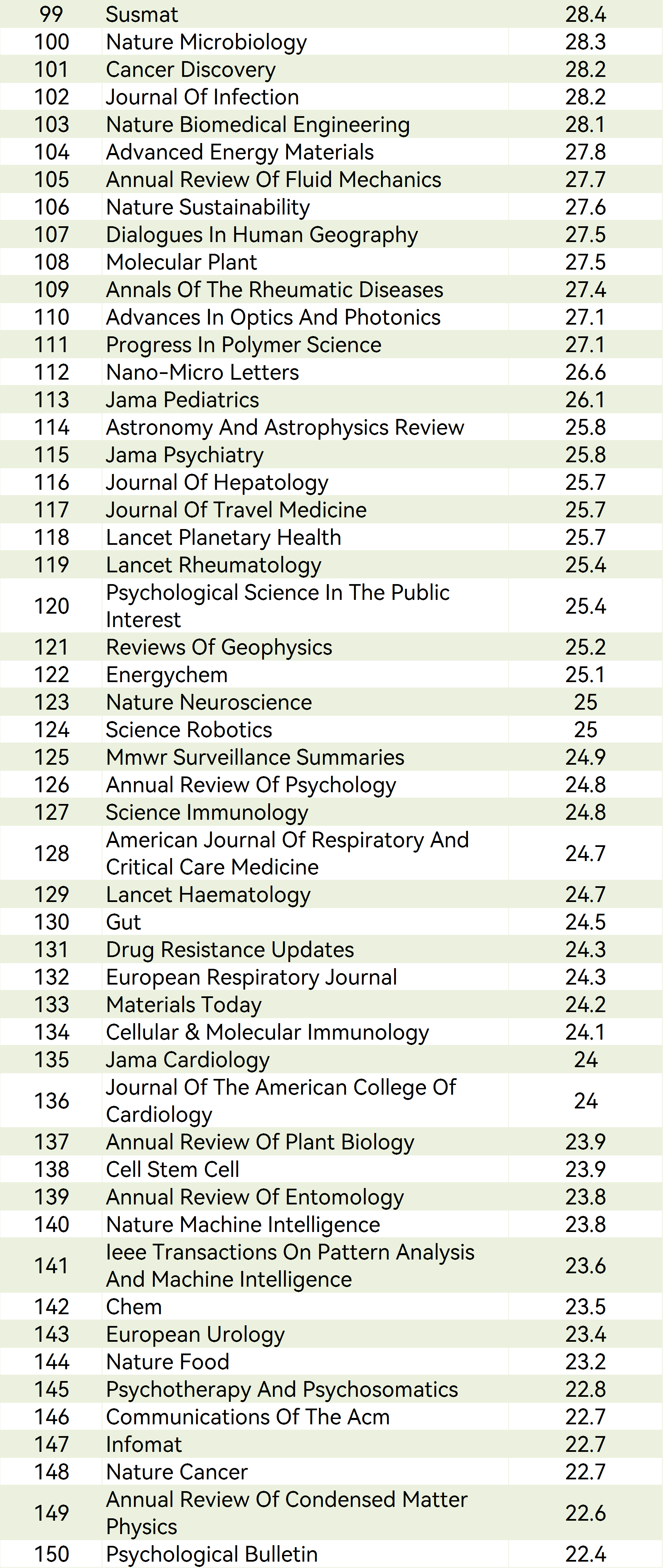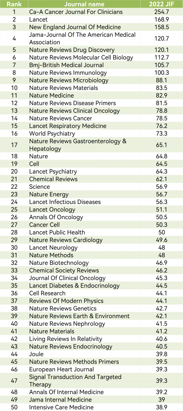 6月28日,2023年影响因子全新出炉啦!让我们一起来看看这些期刊今年的表现吧! 最高分的期刊 Ca-a Cancer Journal For Clinicians(IF=254.7) CNS Cell(IF=64.5) Nature(IF=64.8) Science(IF= 56.9) 前600期刊影响因子排名 分类: 最新重要进展, 每周进展汇总admin六月 29, 2023评论