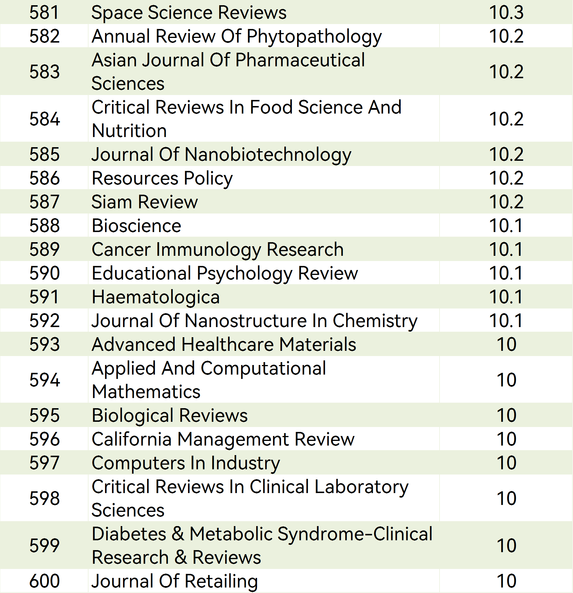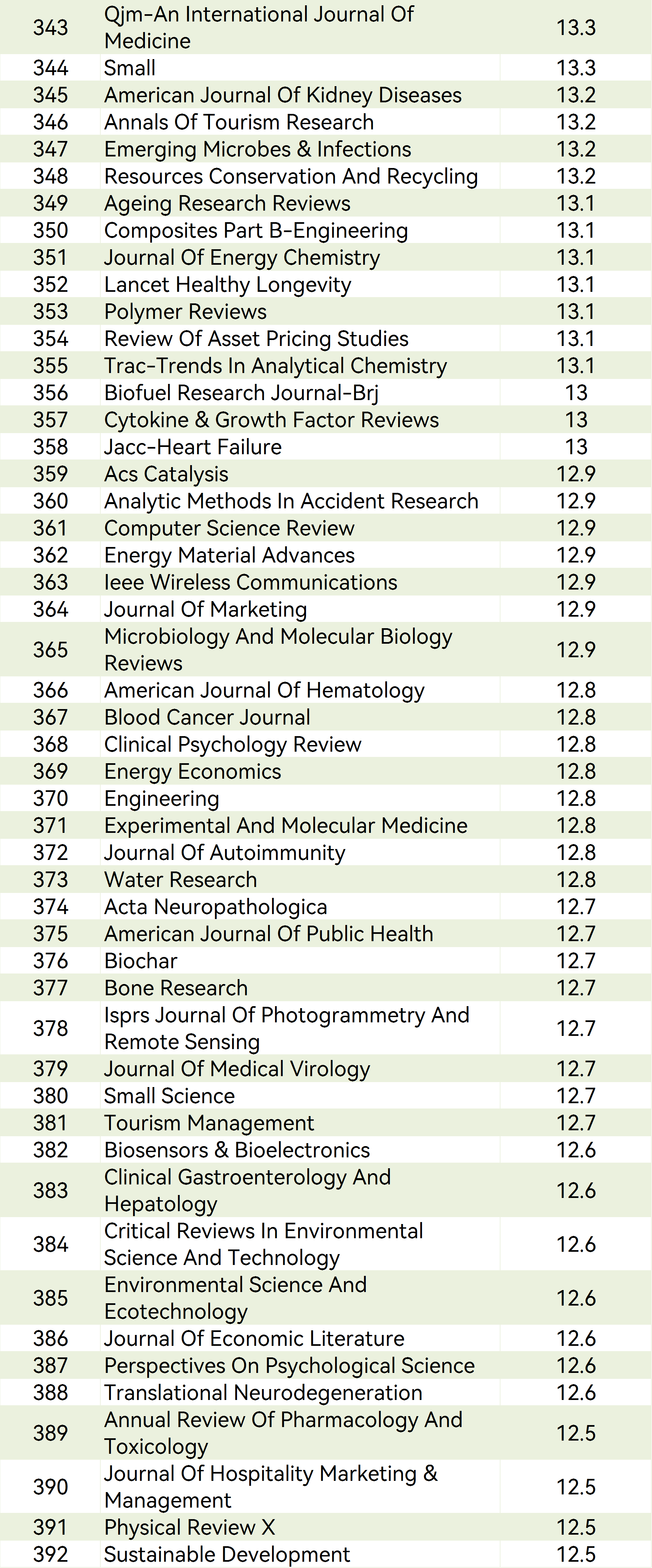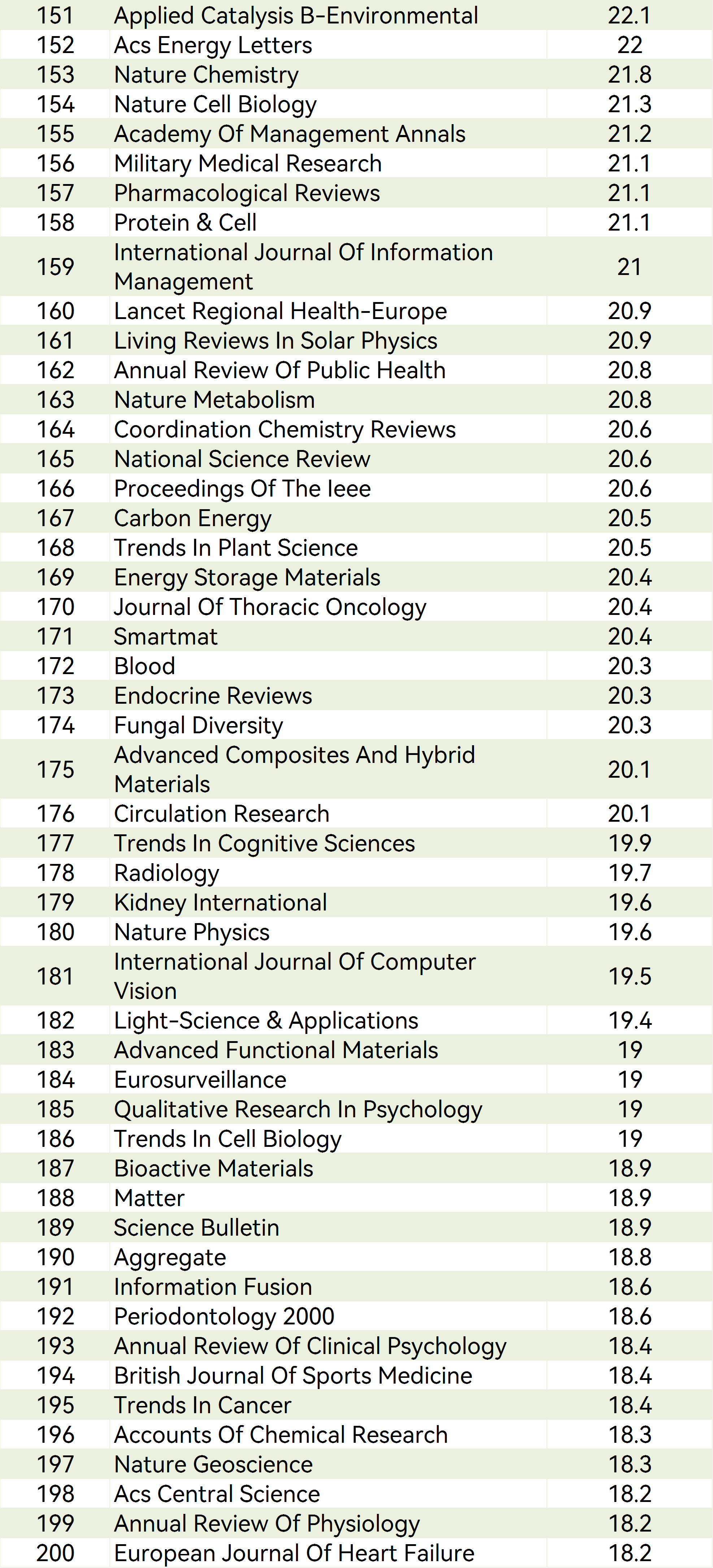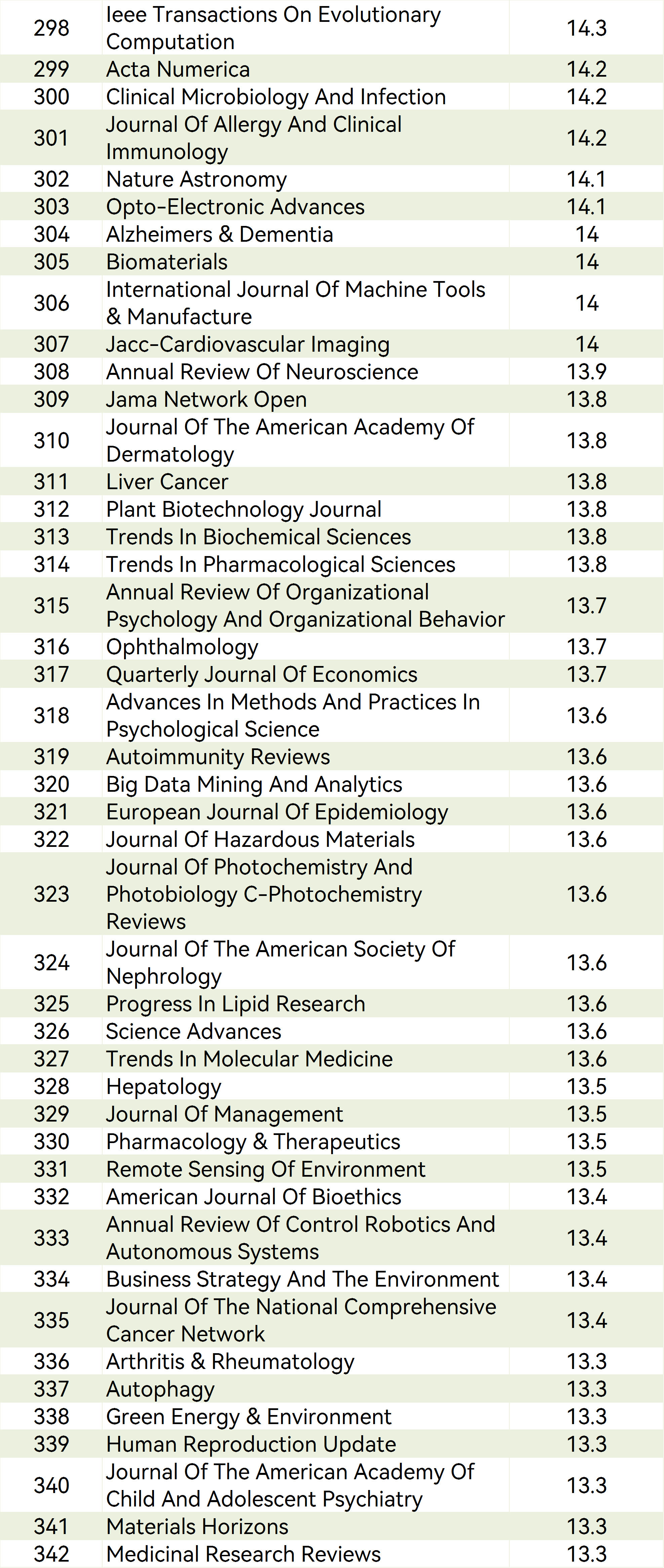6月28日,2023年影响因子全新出炉啦!让我们一起来看看这些期刊今年的表现吧! 最高分的期刊 Ca-a Cancer Journal For Clinicians(IF=254.7) CNS Cell(IF=64.5) Nature(IF=64.8) Science(IF= 56.9) 前600期刊影响因子排名 分类: 最新重要进展, 每周进展汇总admin六月 29, 2023评论